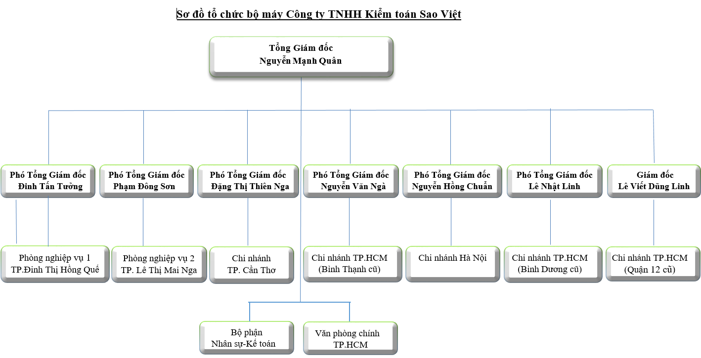 Công ty TNHH Kiểm toán Sao Việt có hơn 80 cán bộ nhân viên, trong đó có 22 Kiểm toán viên có nhiều kinh nghiệm trong lĩnh vực kiểm toán và đã từng nắm giữ các chức vụ quan trọng trong một số Công ty Kiểm toán tại Việt Nam. Cán bộ nhân viên của Công ty thường xuyên được đào tạo, cập nhật kiến thức chuyên ngành thông qua các chương trình huấn luyện nội bộ, chương trình cập nhật kiến thức Kiểm toán viên hàng năm của Bộ Tài chính, các chương trình tài trợ quốc tế.